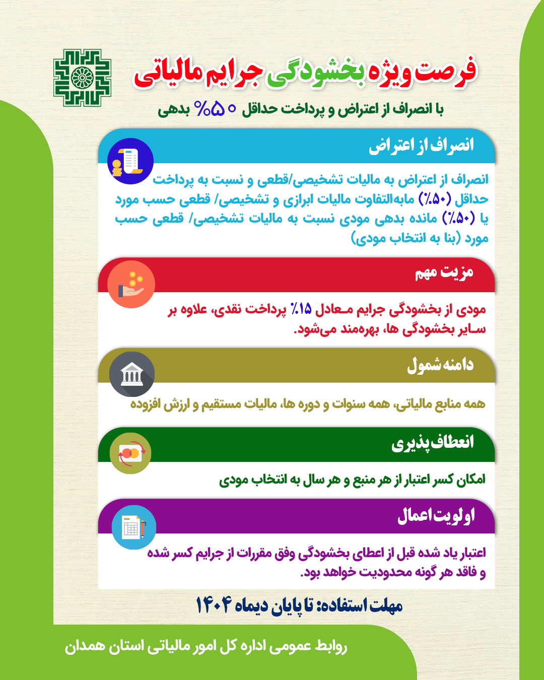 به گزارش ندای غرب به نقل از روابط عمومی ادارهکل امور مالیاتی استان همدان، وجیه اله ذکوری مدیرکل امور مالیاتی استان همدان با اعلام این خبر اظهار داشت: در راستای حمایت از مؤدیان و تسهیل در تعیین تکلیف پروندههای مالیاتی، به موجب ابلاغ سازمان امور مالیاتی کشور، مؤدیانی که اعتراض آنان در هیأتهای حل اختلاف مالیاتی، شورای عالی مالیاتی، هیأت موضوع ماده ۲۵۱ مکرر و یا دیوان عدالت اداری مطرح میباشد، میتوانند از تسهیلات بخشودگی جرائم مالیاتی بهرهمند شوند.