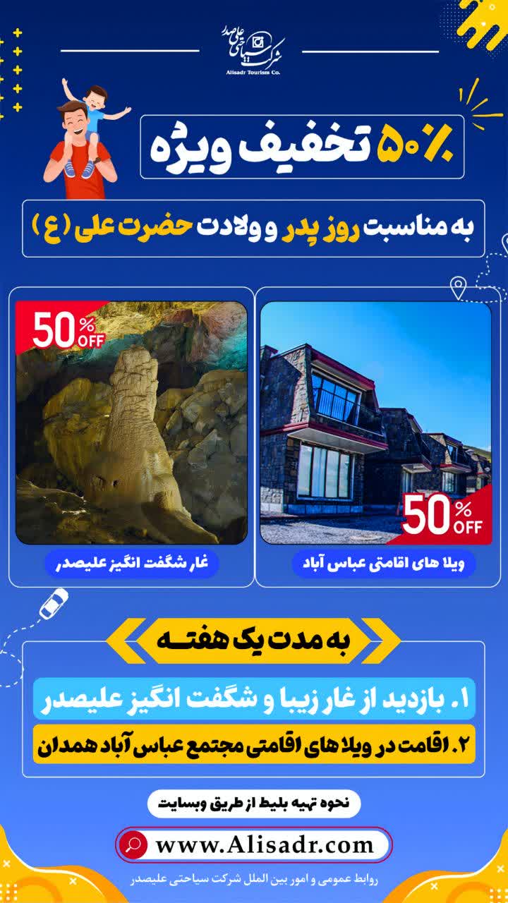به مناسبت گرامیداشت روز پدر و ولادت حضرت علی(ع)، بازدید از غار شگفتانگیز علیصدر و اقامت در ویلاهای سنگی بام همدان با تخفیف ویژه ارائه میشود.