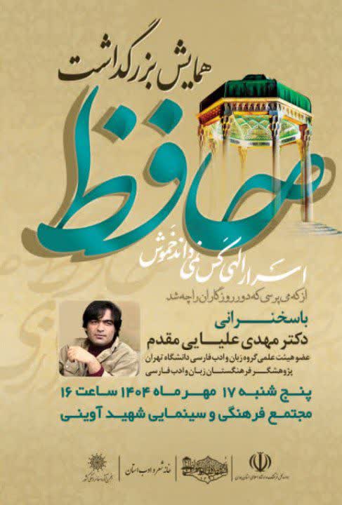 مجید فروتن با اشاره به روز بزرگداشت حافظ در تقویم بیان کرد: همایشی با همین عنوان با سخنرانی «دکتر مهدی علیایی مقدم» عضو هیات علمی گروه زبان و ادب فارسی دانشگاه تهران و پژوهشگر فرهنگستان زبان و ادب فارسی روز پنجشنبه ۱۷ مهرماه ۱۴۰۴ در مجتمع فرهنگی شهید آوینی برگزار میشود.